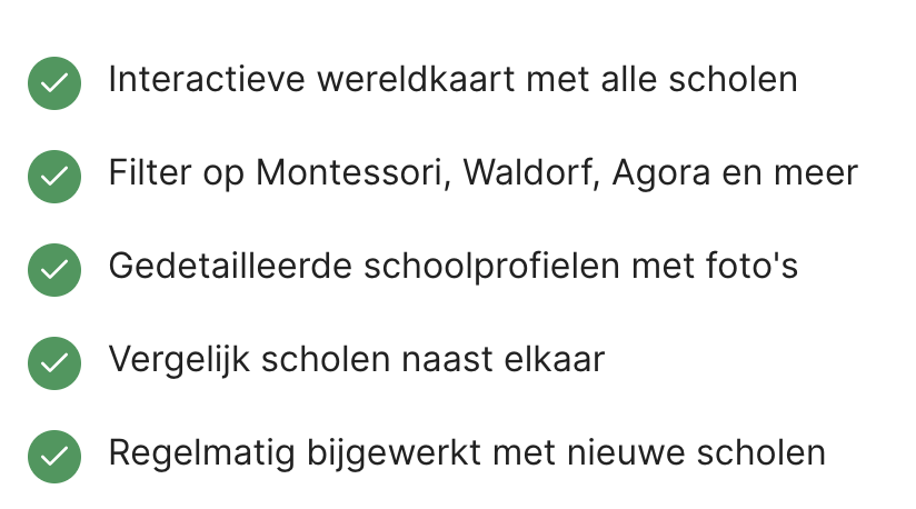 Schools for Change is een online platform met 999+ alternatieve scholen en daycares wereldwijd. Via een interactieve kaart en slimme filters vind je in seconden de leerplek die écht bij jouw kind past.